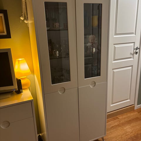 Selger 1 høyskap/vitrineskap. Det er mulig å ta delene fra hverandre og skape to reoler. Det følger med ekstra bein dersom man ønsker å ta dem fra hverandre.
