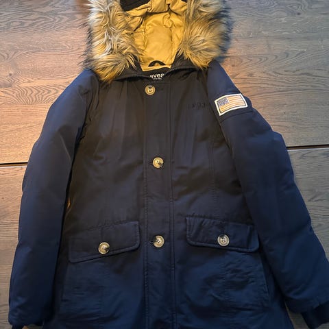 Med tung hjerte må jeg selge nesten ubrukt dunnkåpe i burgundy /vinrød farge.