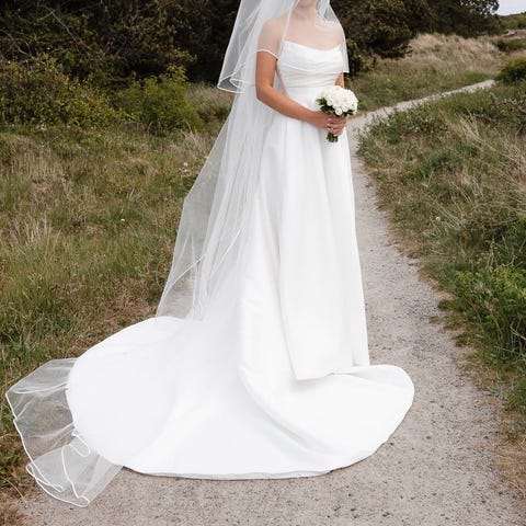Selger min nydelige brudekjole med splitt fra Adore by Justin Alexander i str M/38. Kjolen er kjøpt på Brudesalongen i Larvik høsten 2021, og ble brukt en gang sommeren 2022. Slør (med blonder på kanten) følger med ved kjøp.