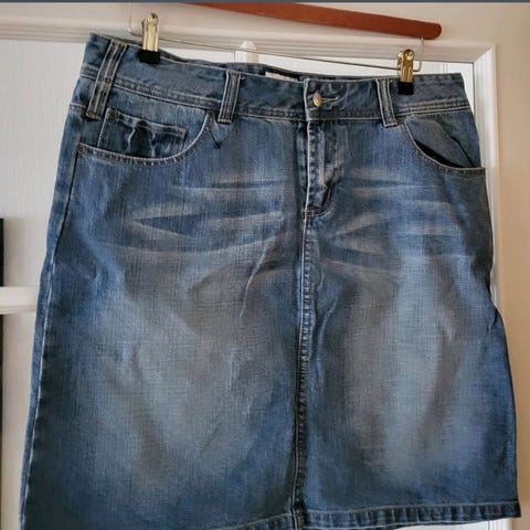 Pen demin skjørt str. 50, lengde 77cm, en liten bytt strykk i livet, mål 47x2, men kan utvides til 52cm