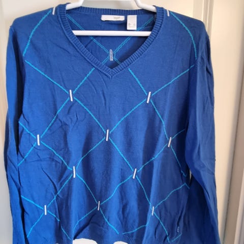 Pen genser, med flotte detaljer, str. L, brystvidde 55cm, lengde 69cm