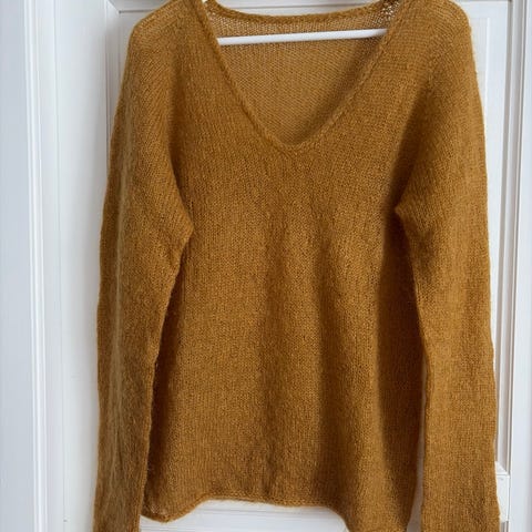 Gul og lekker genser. Litt lang (68 cm) og romslig modell. Vid rund hals og ballongermer.