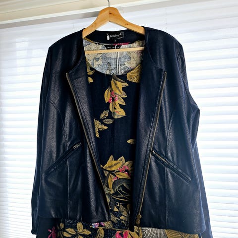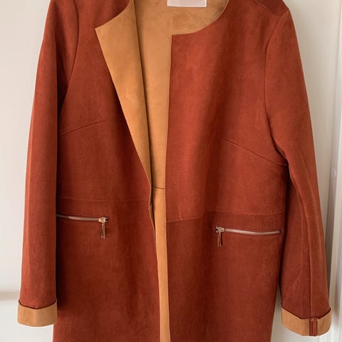 U-brukt jakke fra Bohemé Str 4. Lett, mykt stoff som ser ut som semsket skinn. Mål ua-ua 64 cm. Fra skuldersøm til nederkant 60cm. Butikkpris 1500.-. Like tøff til kjøle/skjørt som til bukse. Oppbevart i røykfritt hjem uten husdyr. Kan sendes.
