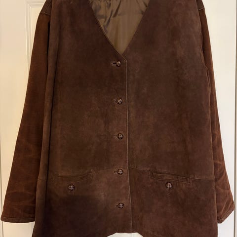 Jakke har skjulte knapper foran, pynteknapper bak. Skulderputer.