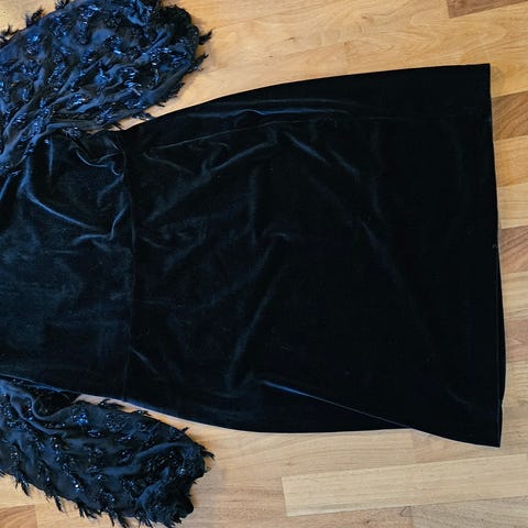 Sort Fløyelskjole fra In Wear, brukt en gang selges blitt for stor. Ca 116 cm lang. Xl. Ingen flekker eller hull.