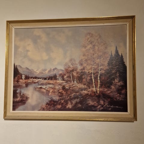 Bilde med fugl og blomster. Svart ramme. Bildet har løsna fra rammen, kan festes med feks teip. Ikke synlig på fremside. Sjå bilde.