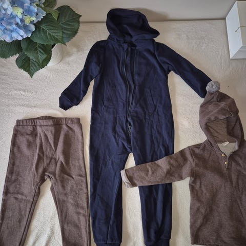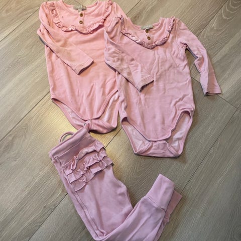 Pent brukt vilje og ve body og to bukser. Super søtt med rysjer på rumpen. Mørk blått. Bomull innerst, ull ytterst. Knapper i nakken.