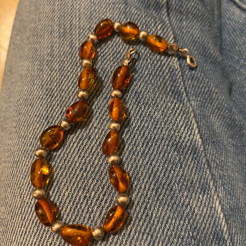 Ikke særlig brukt. Lå mest i skapet. Halskjede lengde varierer fra 42 til 45 sm. Selges samlet eller separat. Lys lilla perler str. Circa 1.2 sm x 1.6.