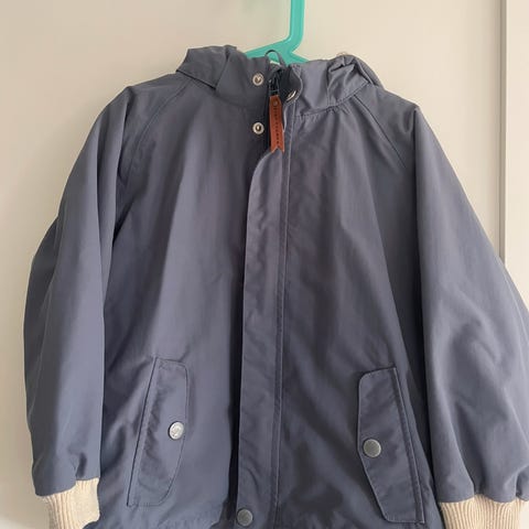 Deilig regnjakke/frakk med frotte-aktig fór, lun og god. Med hette og lommer.