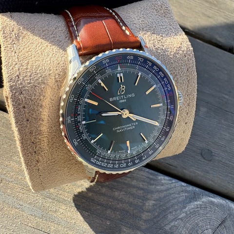 Medfølger en original Breitling skinnreim med hvit søm. Skinnreim kostet alene 4000,- da den ble kjøpt i 2012.