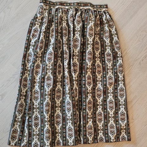 Laget av meg selv til meg selv, da jeg skulle i vinterbryllip. Jeg er 160 høy, 72 cm i midjen og med litt høye heler rekker skjørtet akkurat til bakken (subbber ikke). pent og unikt skjørt, men må gjøre plass til nye sy prosjekter.