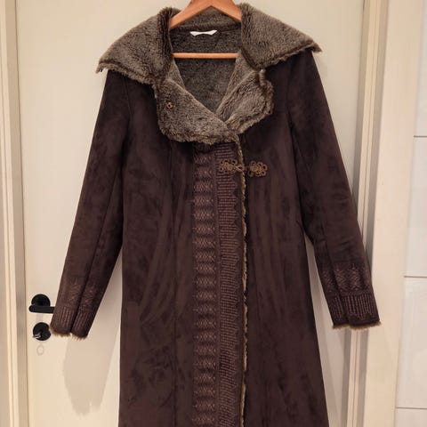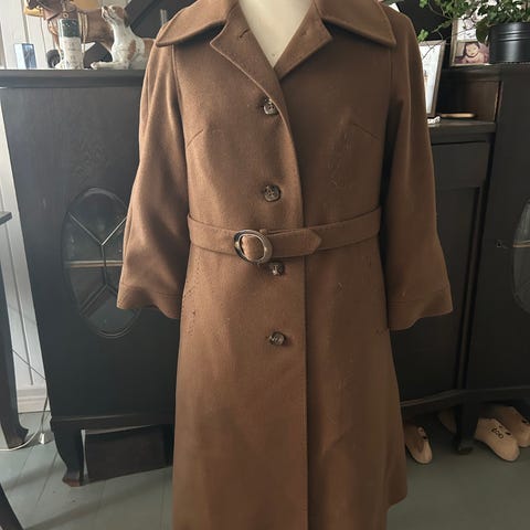 En fantastisk nydelig kåpe som jeg håper kommer til rette eier! Jeg kjøpte kåpen i en vintagebutikk på Hamar for et par år siden. Jeg tok sjansen og vasket den på finvask i maskinen, noe som gikk helt fin ( selv om det står at den skal renses, jeg har en ny vaskemaskin så tenkte derfor at det gikk bra☺️😉). Jeg har gått over alle innvendige sømmer/sydd og forsterket de, noe også på foret, men ikke under/i selve ermene. Jeg har også satt i nye knapper. Vaskeanvisningen innvendig tyder på at dette er en god vintagekåpe, men jeg syntes det er vanskelig å antyde årstall.