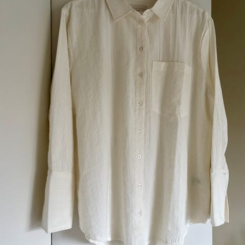 Den perfekte hvite skjorte fra Hunkydory. Lin.Str S. Litt lengre bak enn forann. Flotte, lange mansjetter. Kun brukt en gang. Selges kr 400,-.