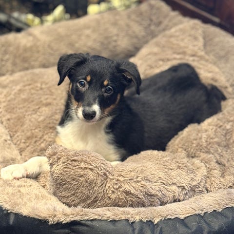 Vi har en nydelig sort og hvit hannhund ledig for femstjerners hjem. Han er straks 8 mnd gammel (15.04.26) ✨💙