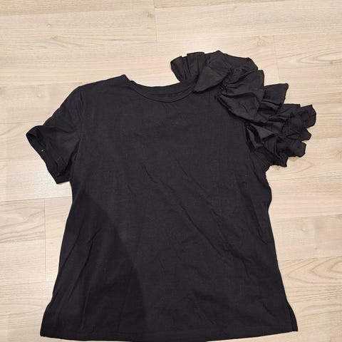 Pen myk sort t-shirt med rund hals, splitt i sider og dekorative ermer.str.L, selges kr.50.