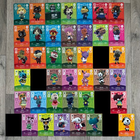 Selger unna noen Amiibo kort fra Animal Crossing.
