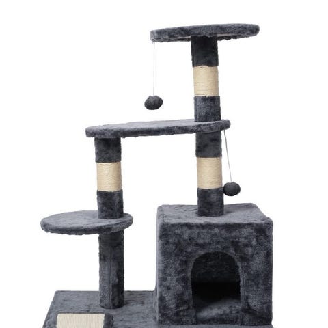 Den plysbelagte overflaten er dekket av sisaltau, som er svært behagelig og praktisk for kattens sine klør. Kattene dine vil like å jage hverandre rundt mens de hopper opp og ned i dette klorestativet. Våre klorestativ for katter er designet med et koselig hus hvor katten kan ta en lur eller slappe av. Den kommer også med 3 museleker, plattformer og hvilesteder for å holde din lille venn underholdt. Basen er solid og stabil.
