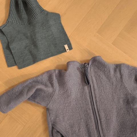 JOHA jumpsuit i 100% Merino-ullfleece med glidelås og tryllefot - Grå. Perfekt sett med Balaklava meget pent brukt. Str 80, men stor for størrelsen. Kan brukes til og med 4 år.
