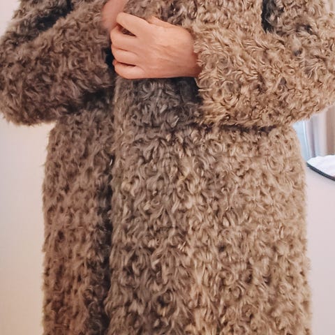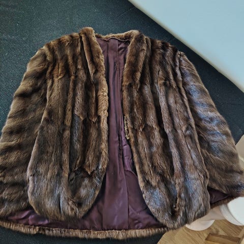 Stola i kaninpels. Hel lengde 95cm, Nakkebredde 10cm og 13cm bredde i endene.