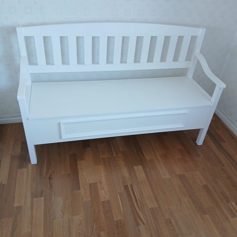 Sort malt liten trebenk som passer inn i flere soner i innredning. Lett og flytte og god å sitte i med gode armlener med kuler/ som håndtak! Benken er brukt innendørs, men er flyttet ut ved pent vær i kortere perioder. Den er litt malingslitt på noen områder, men ellers hel og pen. Kul som styling objekt!