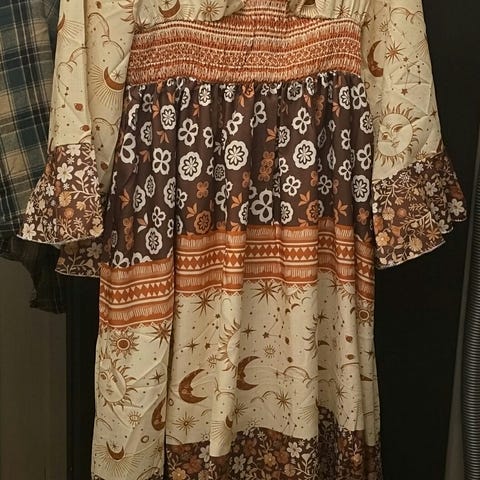 Det står str s i den, men passer best til str M. Lett kjole i friske farger. Går til nedom tykkleggen på meg som er 169 cm