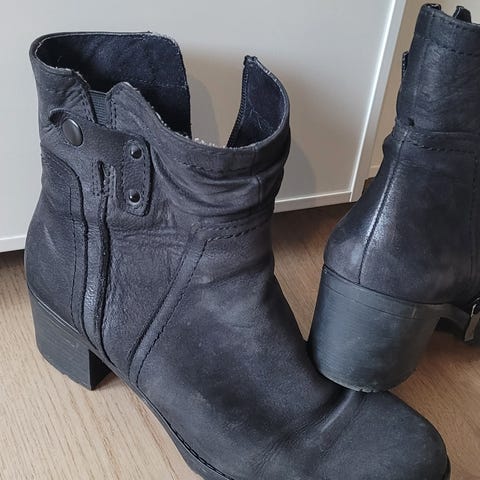 Veldig gode sko som er minimalt brukt. Fordi det er elastisk strikk oppå lesten putter du foten rett ned i skoen.