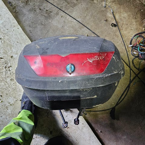 Liten bagasjeboks for mc /moped/atv selges, sku tippe 20-30 liter den rommer , kan sendes , kr 400, fungerende lås og feste