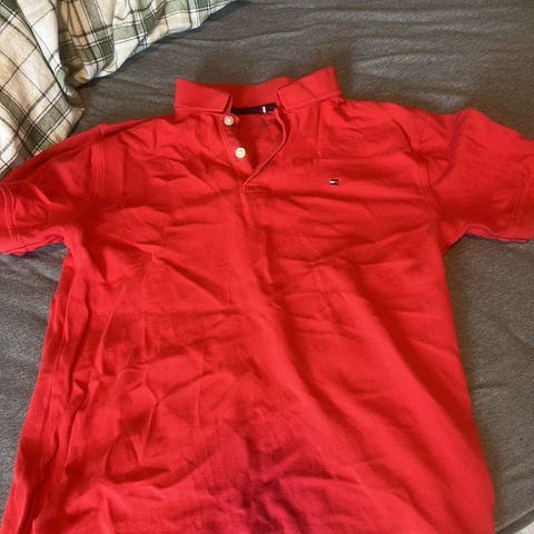 Hilfiger-logo på bryster og detaljer i rødt, hvitt og mellomblått