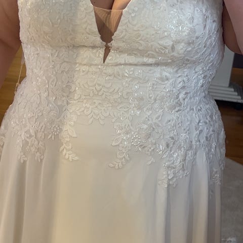 Selger brudekjolen min, str M. Ikke lagt inn rundt siden, bare litt i lengden. Er 166 høy og hadde 5 cm hæl. Legger ved bilder fra jeg hadde på i salong og bilder fra nettet. Selger å et 3 meter langt slør til kr 1000, nypris 3000. Alt er kjøpt på Christiane Brudesalong i Sandvika. Kjolen selges til kr 7000. Nypris kr 15 000.