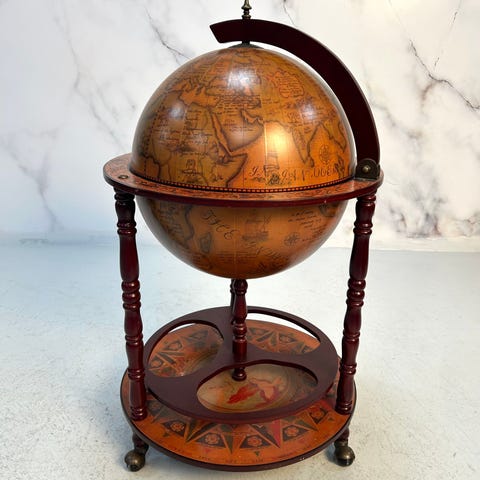 Globusen står på hjul slik at den er enkelt å flytte på. Den er utstyrt med et gammelt verdenskart. Med flaske- og glassholder er den perfekt for å holde flere flasker og glass. Vennligst merk at flasker og glass ikke er inkludert