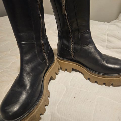 Målebåndet: Tversover linning ca 36 cm. Rise ca 24cm. Innerbenslengde ca 79cm.