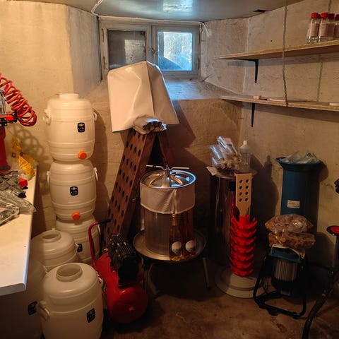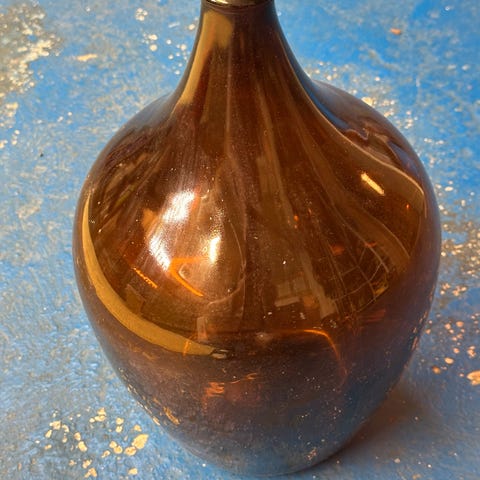 30 liters ballong opprinneleg brukt til Maursyre for ensilering av gras/silo. Seinare brukt til oppbevaring av heimelaga øl eller som gjæringkar for laging av vin. Med original grind.