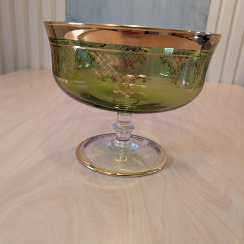 Skål i glass. Champagne farget med gull dekorasjoner. Og litt frostet glass rundt kanten oppe.