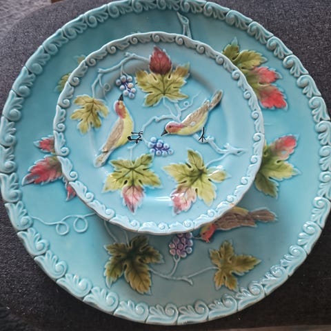 Middagstallerken fra Adams, England, "The Birds of America"-serien med motiv "Baltimore Oriole" etter originale tegninger av John James Audubon. Håndkolorert. Samleobjekt for fugle-elskere.