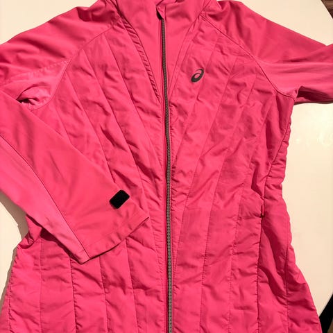 Tynn treningsjakke / vindjakke i størrelse small fra Asics. Har hette og kan snøres inn nederst. Den er lett og myk på. Lite brukt.