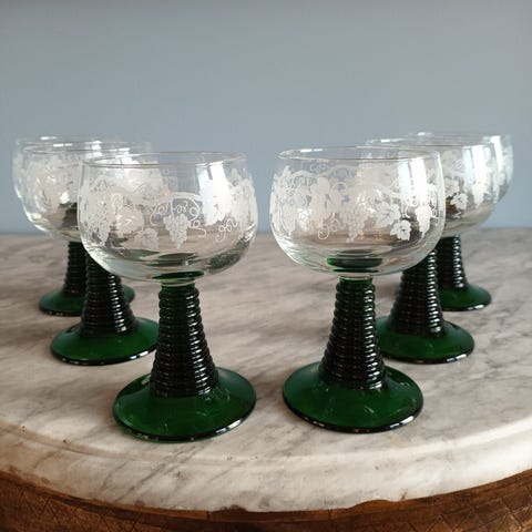2 veldig flotte munnblåste vinglass fra Reijmyre Glasbruk - Antik - med vinblad-dekor - selges samlet for kr 800,-.