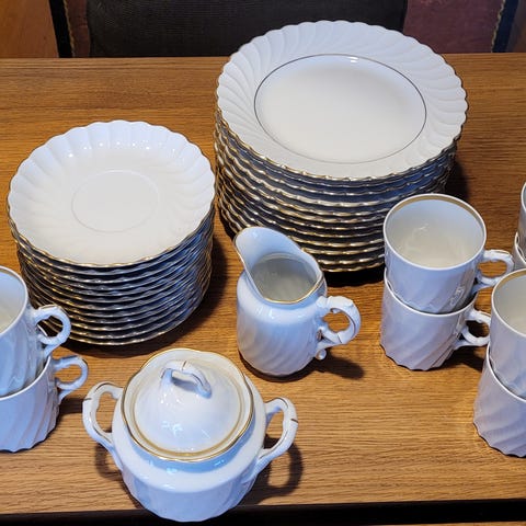 Porsgrund Bogstad hvit med gullkant, 8 asjetter med diameter 18 cm.