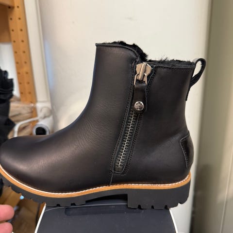 Klaveness skinn sko med trykknapp, enkel å ta av og på da spennen stilles inn og så er det trykknapp under som brukes når skoen er tilpasset. Lite brukt topp kvalitet sko, ser ut omtr som ny. Størrelsen er 5 som tilsvarer ca 38. Skoen er god på størrelse, så den passer nok deg som bruker ca 38,5 - liten 39. Behagelig på foten, og passer like godt til bukse som til kjole eller skjørt. Skoene er veldig fine både inni og utenpå. Se de to siste bildene som jeg tok ute for å vise hvor flotte de er inni (var litt dårlig fotolys på innebildene)