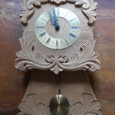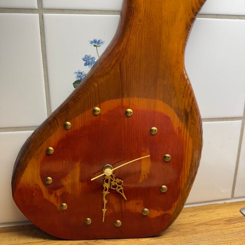 Min svigerfar drev med treskjæring og laget sine egne mønstre. Klokken har en diameter på 40cm. Da jeg har en tilsvarende selger jeg denne.