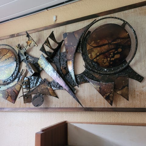 Godt bevart kunsbilde/kunstmaler/designer.Danske kunstren Henrik Horst .Født 20november 1942.Danmark.Metalkunst veggkunst ,fra tilig 60tallet.Mål på bilde. 92X42. Vekt ca 15 kg.Selger 700
