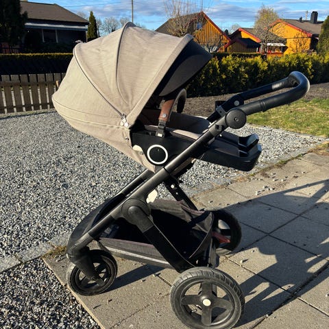Selger vår pent brukte kvalitetsvogn Stokke Trailz, inkludert original stelleveske fra Stokke og koppholder.