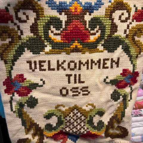 Pen brukt håndlaget brodert åkle/ teppe til vegg. Vakkert broderi, og er penere i virkeligheten en på bildene.