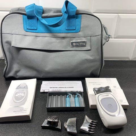Har dessverre ikke eskene , men de ligger pent i en toalett mappe også fra Nuskin, legger også med en ny pakke gel som tilhører GalvanicSpa , alt fra Nuskin