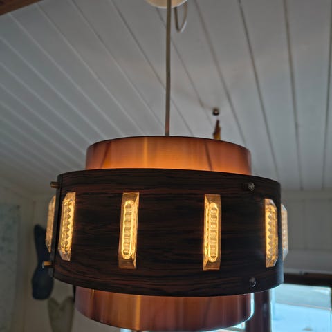 Stor flott retro taklampe i kobber og farget glass. Lampen har en stor flott glasskuppel med kobber metall rundt i en bord med mønster. Taklampen er stor og kan henge over et spisebord. Lampen er neste. 30 cm i diameter. Taklampen er gammel / retro men i svært god stand. Kobberfargen på metall er mørk men går i både kobbertoner og i mørke nærmest sorte fargetoner. En unik lampe som ingen har maken til.