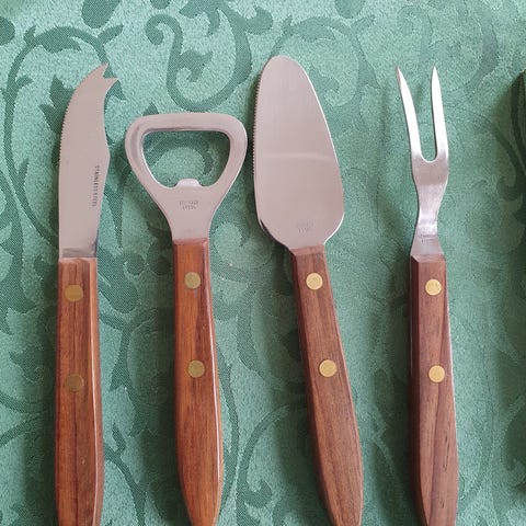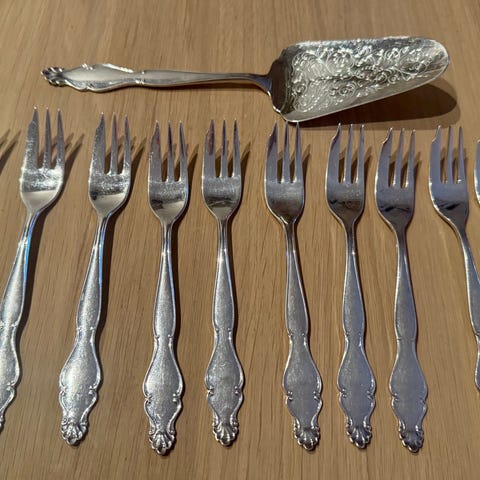 Pent eldre kakesett med kakespade og 6 kakegafler med mørk trehåndtak. Kakespaden er ca 23cm og gaflene ca 17cm. I orginaleske. Ser ikke brukt ut.