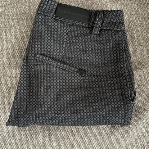 Mørk blå med nydelig mønster. Lekker kvalitet. Korte splitter foran, nederst på bena.