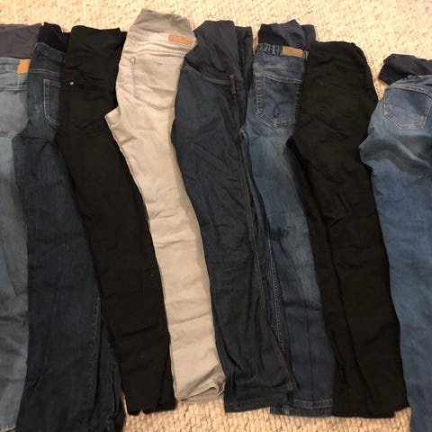 Tre bukser, en treningstights med overdel, en shorts. Pent brukt. Fra str 36-40