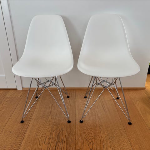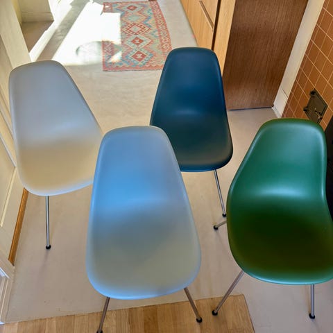 Selger 3 stk Eames plastic chair DSX i polypropylene, i fargene gul, oransje og grønn. Alle med chrome finish på beina. Det er dessuten sorte knotter på alle stolene. Noter den grønne stolen har en løs knott. Det kan sikkert bestilles ny fra Vitra.