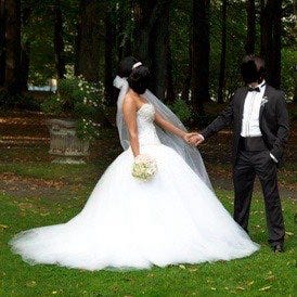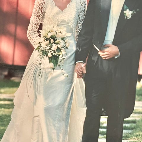 Brudekjole og en fest kjole man kan bytte til litt utpå kvelden. Følger med slør og en varm kåpe man kan ha over skuldrene hvis det er litt kaldt. Usikker på størrelse. Ikke renset. Noen småskader, men tror ikke dette vil synes når man har den på. Se bildene.