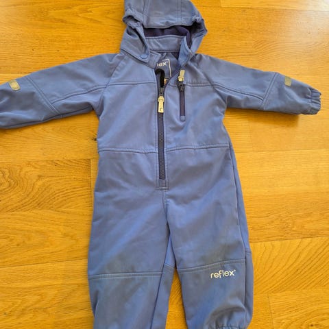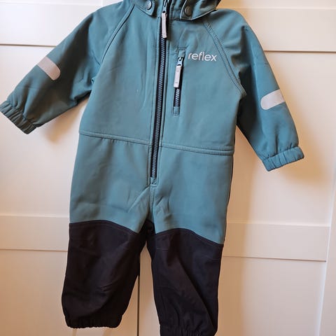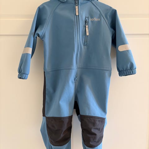 Softshelldress i str 80. Lys blå fra Reflex, svak farging på knærne og litt svake grønskeflekker i rumpa, men lite synlig når dressen er på barnet. Kan sende bilder om ønskelig